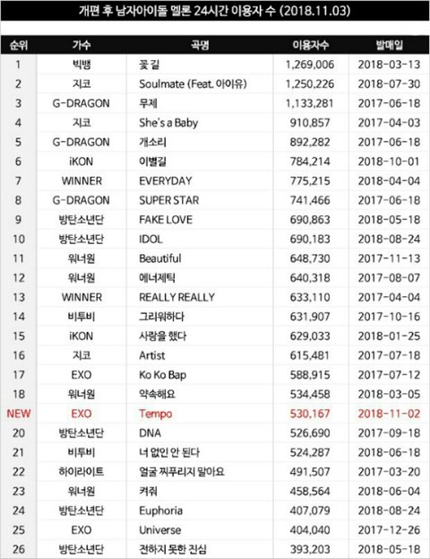 개편후 남돌 24시간 사용자수 순위(ft.엑소)