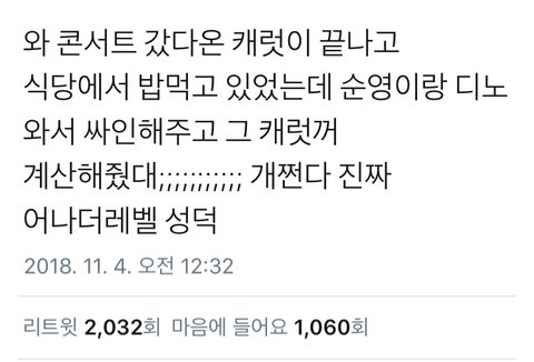 타팬인데 우연히 트위터하다 호시 썰 올라온거 봤는데 대박임... 세븐틴 콘서트 보러갔던 캐럿이 콘서트끝나고 밥먹으러 식당갔다 호시랑 디노 봤는데 호시가 결제도 해주고 싸인도해줬대....ㄹㅇ성덕아니냐 ㅈㄴ부럽다