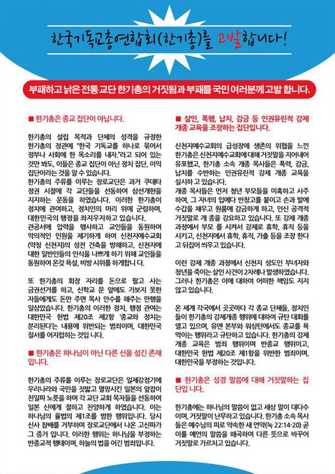 부패하고 낡은 전통 교단 한기총의 거짓됨과 부패를 국민 여러분께 고발합니다.