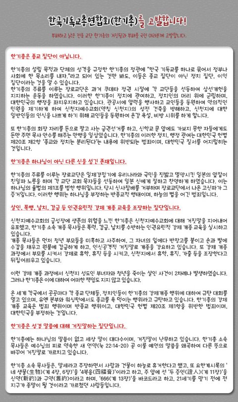 ■ 한기총은 성경 말씀에 대해 거짓말하는 집단입니다. 한기총에는 하나님의 말씀이 없고 세상 말이 대다수이며, 거짓말이 난무하고 있습니다. 한기총 소속 목사들은 예수님의 피로 약속한 새 언약(눅 22:14-20) 곧 이룰 예언의 말씀을 왜곡하여 다른 뜻으로 바꾸어 거짓말로 가르치고 있습니다. 한기총 소속 목사들은, 말세라고 주장하면서 사람과 건물이 하늘로 휴거한다고 했고, 또 요한계시록의 ‘네 생물(生物)(계 4장, 6장)’을 ‘4복음(四福音)’이라고 하고, 주 앞에 선 ‘두 증인(證人)(계 11장)’을 신약(新約)과 구약(舊約)이라고 하며, ‘666(계 13장)’을 바코드라고 하고, 21세기를 맞기 전에 전 지구가 종말이 될 것이라고 가르쳤던 사람들입니다.예수님은 두 가지 씨가 예수교회에 뿌려져 있다고 마 13장에 말씀하셨고, 이 씨는 말씀이라고 하셨습니다(눅 8:11). 하나님의 진리의 말씀의 씨는 하나님의 아들이 되고, 거짓말(가라지) 씨는 마귀 말이며 마귀의 자식이 된다고 하셨습니다(마 13:38-39). 신천지는 잘못 알고 있는 거짓말을 참말 진리로 고쳐 주고 있습니다. 거짓말 씨로 나서 마귀 자식이 되어 지옥 가는 것보다 진리의 씨로 나서 하나님의 아들이 되어 천국 가는 것이 낫습니다. 한기총은 마귀의 씨 거짓말을 심어 교인들을 마귀 자식으로 만들고 모두 지옥에 보내고 있는 것입니다. 이는 죄 중에 가장 큰 죄이며 반종교 행위입니다. 전통인 한기총이 낡고 부패하여 갖은 죄를 지으면서, 하나님께서 약속하신 예언의 말씀(신약, 계시록)을 200여 가지나 왜곡하고 거짓말을 지어 성도들에게 먹였고, 신천지가 가르치는 정통 계시 말씀을 사이비 이단으로 규정하였습니다.이에 신천지는 어디가 참 정통이고 어디가 사이비 이단인지 가리기 위해 신약 성경 중 예언서에서 100개의 문제를 내어 시험을 치자고 수차례 한기총에 편지를 보내 제안하였습니다. 이 시험의 결과로 사회와 정치계에 더 이상 혼돈을 주지 말자고 하였으나, 아직까지도 한기총에서 단 한 사람도 이에 응하는 목사나 신학 박사가 없습니다. 이는 한기총이 말씀이 없다는 증거이고, 결국 신천지에 진 것입니다.■ 한기총은 국민을 둘로 나누고 평화와 통일을 반대하는 반국가·반사회집단으로, 없어져야 합니다.