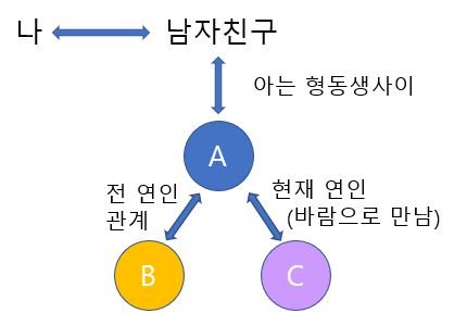 우선 관계를 정리하자면나와 내 남자친구가 있고,남자친구의 아는 남자 동생A가 있음(나는 얼굴만 아는 사이)남자A가 꽤 오래 만난 여자친구B가 있었었는데직장 내에서 여자C랑 바람이 났고, 현재는 B를 정리하고 C와 만나고 있음