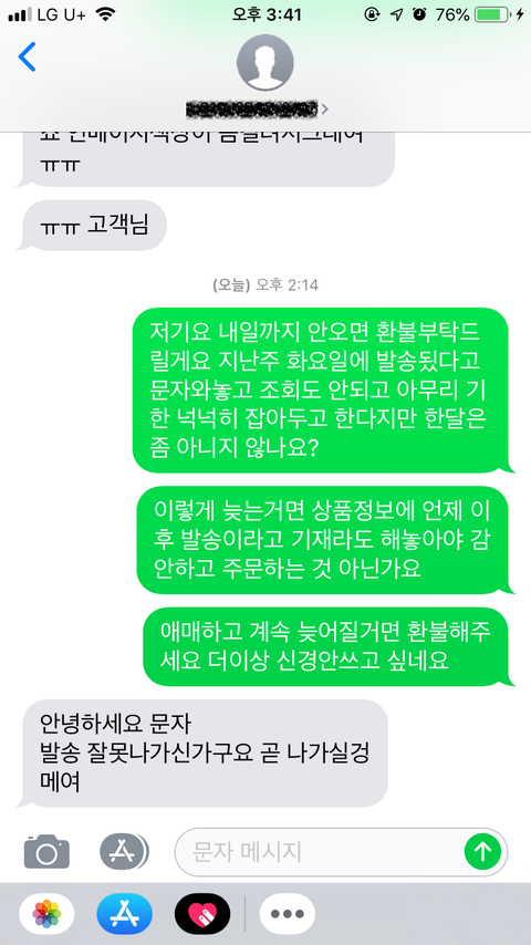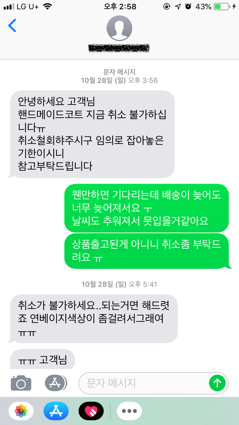 -본인 : 아씨.. 죄송한데 일단 늦어졌으니까 그냥 취소 해주세요. 아직 발송도 안됐잖아요.