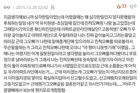 나 이거 전에 판에서 봤는데 12년 지기 친구가 성폭행 당할뻔 한적 있는데 친구가 다른 사람한테 그 사람을 소개 시켜준거.. 조카 소름이었음..ㅋㅋㅋㅋ
