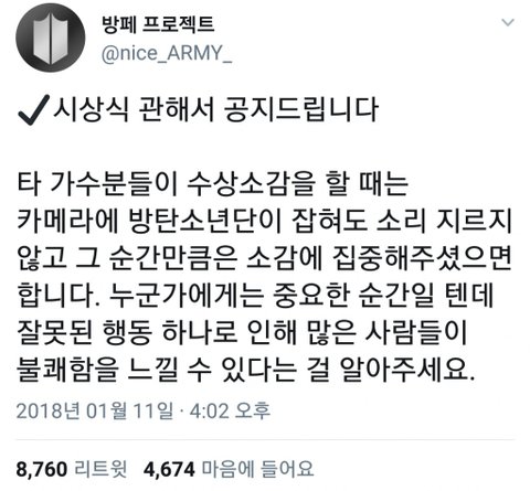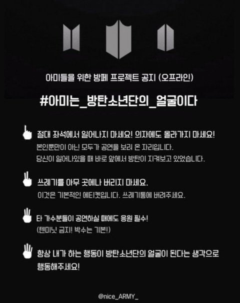 꼭 지킬수 있도록 해줘 늘 가수의 이미지는 팬들의 태도도 포함된다는걸 잊지말자 타가수와 그 팬분들에게도 피해끼치면 안되는건 당연한거구!