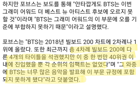 https://news.nate.com/view/20181106n10464?mid=e1100 최근 포브스 기사에 따르면 방탄소년단은 신인상 격인 The Best New Artist 후보에 오르지 못하게 됐다. 방탄소년단이 빌보드메인 차트인 빌보드200 1위 앨범을 2개나 소유하고 있지만 신인상 후보 선정 기준에는 부합하지 않아 제외됐다는 것. 포브스에 따르면 방탄소년단은 수년간 한국 뿐 아니라 미국에서 음악을 발표해왔다. 과거 방탄소년단은 4개의 타이틀 트랙을 빌보드200에 올렸지만 한 곡이 40위에 진입했을 뿐 큰 두각을 나타내지 못했다. 그들이 가장 뜨겁게 주목 받은 올해 심시기간에는 너무 다작을 했다. 방탄소년단은 2018년에만 총 70곡을 발표하며 그야말로 '열일'했다. 그래미 어워드 내부 규칙에 따르면 신인상 후보는 3개의 앨범, 또는 30개 이하의 곡을 발표한 가수를 대상으로 하고 있다. 방탄소년단의 경우, 인생에서 단 한번 받을 수 있는 신인상을 받기엔 너무 다작을 해서 부적합 판정을 받았다. 그래미어워드는 엄격한 규칙으로 시상식의 권위를 유지해왔다. 그래미의 엄격한 기준으로 인해 큰 인기를 얻은 곡이나 가수가 상을 못 받게 되는 경우도 있다. 'The Best New Artist'는 상업적 성공보다 새로운 아티스트 발굴에 의미를 두는 분야로 알려져 있다. 아이러니하게도 너무 큰 성공과 많은 곡 발표가 문제가 될 수 있다. 같은 기준으로 올해 큰 성공을 거둔 가수 포스트 말론 역시 신인상 후보에서 제외됐다. 내가 읽은 기사랑 뉘앙스가 좀 다른데..