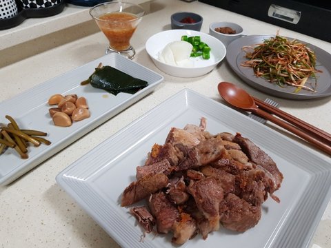 겉바속촉 수육입니다 마늘소스만들었더니 파는거랑 맛똑같다고 맛있다고 하는 신랑덕분에 요리할맛나용
