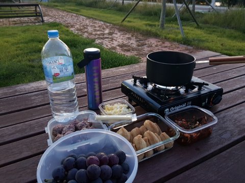 유부초밥 참치주먹밥 감자사라다 챙겨서 근처공원에서 라면만 사서 먹었어요 날씨와 풍경이 좋으니 음식도 더 맛있게 느껴졌어요