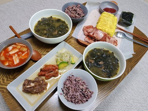 신랑이 미역국 직접 끓이고 계란말이말고 자취스타일 스팸(숟가락으로퍼서굽기) 구워서 한상차려줬어요 계란말이 잘됐다고 뿌듯해하는모습보니 웃기고귀여워서(죄송함당)