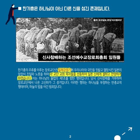 한기총의 주류를 이루는 장로교단은 일제강점기에 우리나라와 국민을 짓밟고 멸망시킨 일본의 앞잡이 친일파 노릇을 하며 각 교단 교회 목자들을 선동하여 일본 신에게 절하고 찬양하게 하였습니다. 이는 하나님의 율법의 제1조를 범한 행위입니다. 당시 신사참배를 거부하며 장로교단에서 나온 고신파가 그 증거입니다. 이러한 행위는 하나님을 부정하는 반종교적 행태이며, 하늘의 법을 어긴 범죄입니다.