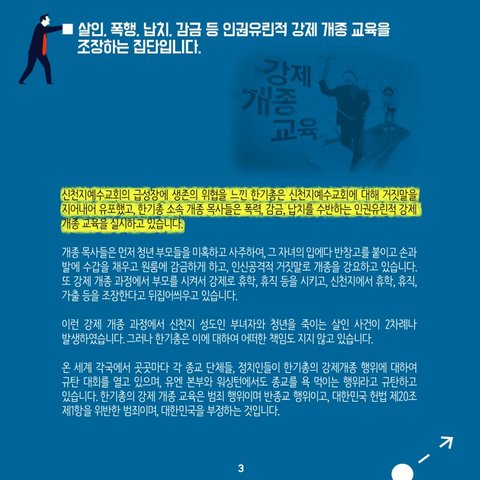 ■ 살인, 폭행, 납치, 감금 등 인권유린적 강제 개종 교육을 조장하는 집단입니다. 신천지예수교회의 급성장에 생존의 위협을 느낀 한기총은 신천지예수교회에 대해 거짓말을 지어내어 유포했고, 한기총 소속 개종 목사들은 폭력, 감금, 납치를 수반하는 인권유린적 강제 개종 교육을 실시하고 있습니다. 개종 목사들은 먼저 청년 부모들을 미혹하고 사주하여, 그 자녀의 입에다 반창고를 붙이고 손과 발에 수갑을 채우고 원룸에 감금하게 하고, 인신공격적 거짓말로 개종을 강요하고 있습니다. 또 강제 개종 과정에서 부모를 시켜서 강제로 휴학, 휴직 등을 시키고, 신천지에서 휴학, 휴직, 가출 등을 조장한다고 뒤집어씌우고 있습니다.