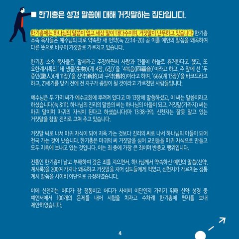 ■ 한기총은 성경 말씀에 대해 거짓말하는 집단입니다. 한기총에는 하나님의 말씀이 없고 세상 말이 대다수이며, 거짓말이 난무하고 있습니다. 한기총 소속 목사들은 예수님의 피로 약속한 새 언약(눅 22:14-20) 곧 이룰 예언의 말씀을 왜곡하여 다른 뜻으로 바꾸어 거짓말로 가르치고 있습니다. 한기총 소속 목사들은, 말세라고 주장하면서 사람과 건물이 하늘로 휴거한다고 했고, 또 요한계시록의 ‘네 생물(生物)(계 4장, 6장)’을 ‘4복음(四福音)’이라고 하고, 주 앞에 선 ‘두 증인(證人)(계 11장)’을 신약(新約)과 구약(舊約)이라고 하며, ‘666(계 13장)’을 바코드라고 하고, 21세기를 맞기 전에 전 지구가 종말이 될 것이라고 가르쳤던 사람들입니다.예수님은 두 가지 씨가 예수교회에 뿌려져 있다고 마 13장에 말씀하셨고, 이 씨는 말씀이라고 하셨습니다(눅 8:11). 하나님의 진리의 말씀의 씨는 하나님의 아들이 되고, 거짓말(가라지) 씨는 마귀 말이며 마귀의 자식이 된다고 하셨습니다(마 13:38-39). 신천지는 잘못 알고 있는 거짓말을 참말 진리로 고쳐 주고 있습니다. 거짓말 씨로 나서 마귀 자식이 되어 지옥 가는 것보다 진리의 씨로 나서 하나님의 아들이 되어 천국 가는 것이 낫습니다. 한기총은 마귀의 씨 거짓말을 심어 교인들을 마귀 자식으로 만들고 모두 지옥에 보내고 있는 것입니다. 이는 죄 중에 가장 큰 죄이며 반종교 행위입니다. 전통인 한기총이 낡고 부패하여 갖은 죄를 지으면서, 하나님께서 약속하신 예언의 말씀(신약, 계시록)을 200여 가지나 왜곡하고 거짓말을 지어 성도들에게 먹였고, 신천지가 가르치는 정통 계시 말씀을 사이비 이단으로 규정하였습니다.이에 신천지는 어디가 참 정통이고 어디가 사이비 이단인지 가리기 위해 신약 성경 중 예언서에서 100개의 문제를 내어 시험을 치자고 수차례 한기총에 편지를 보내 제안하였습니다. 이 시험의 결과로 사회와 정치계에 더 이상 혼돈을 주지 말자고 하였으나, 아직까지도 한기총에서 단 한 사람도 이에 응하는 목사나 신학 박사가 없습니다. 이는 한기총이 말씀이 없다는 증거이고, 결국 신천지에 진 것입니다.■ 한기총은 국민을 둘로 나누고 평화와 통일을 반대하는 반국가·반사회집단으로, 없어져야 합니다.