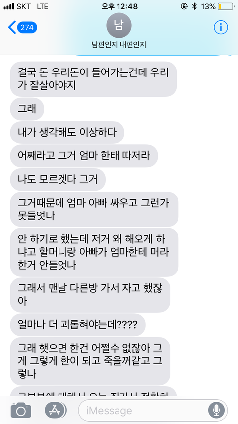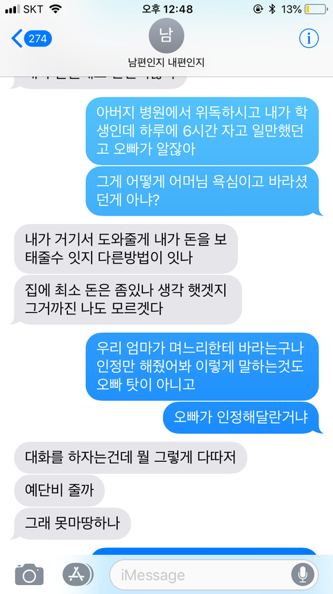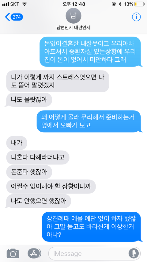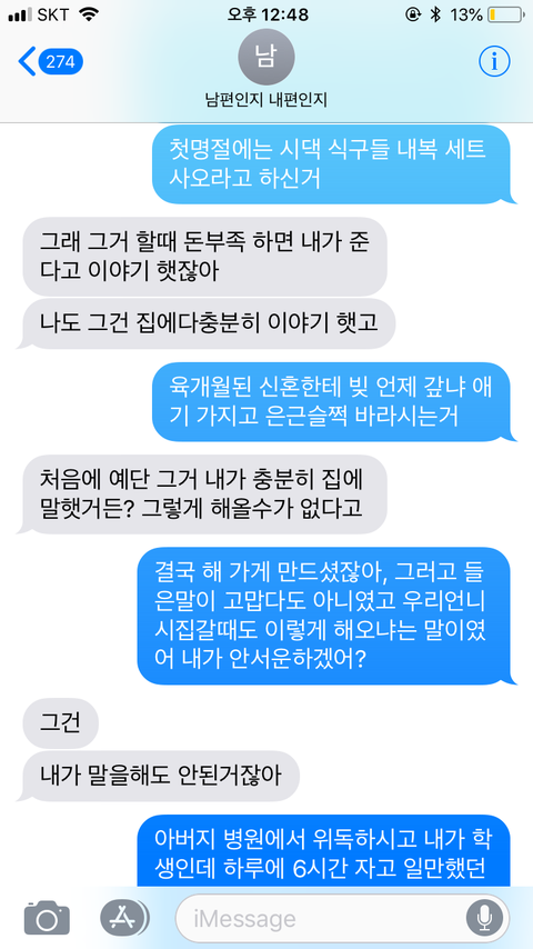"그러면 결혼한지 육개월되었는데 빚갚으라고 독촉하고, 애기 언제 낳을지 정하는게 정상이냐고"
