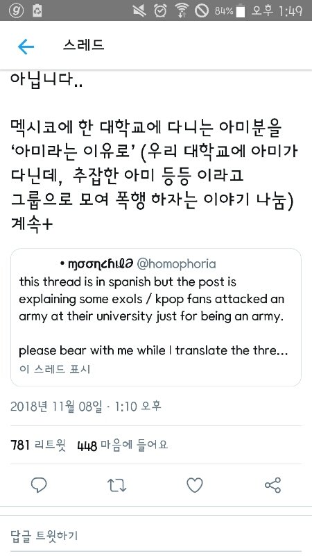 그리고 이건 또 다른 타그룹의 해외팬이 자신의 주변에 있는 방탄 팬이 죽자. 방탄 멤버 중 "ㅈㅁ의 목소리를 듣다가 그렇게 죽었나봐. 쪽팔리게. 내 주변의 모든 아미가 죽었으면." 하고 말하는 트윗