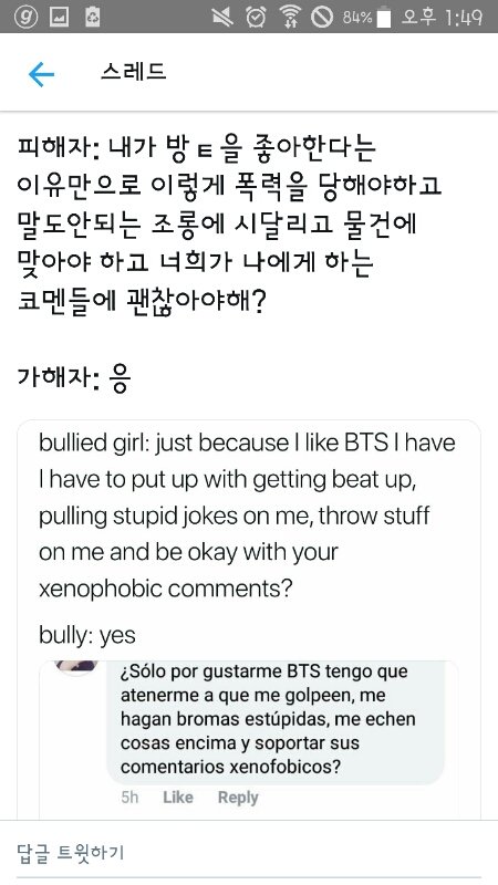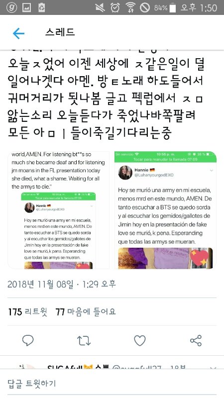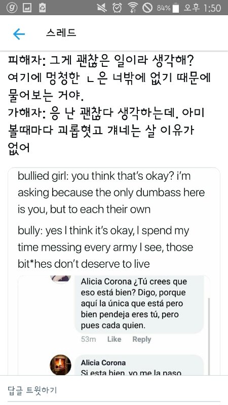 "내가 오직 방탄을 좋아한다는 이유로 이러한 것들을 견뎌내야하냐", 라고 묻자 응. 그들(방탄팬)은 살 가치가 없어. 라고 댓글을 달았어.