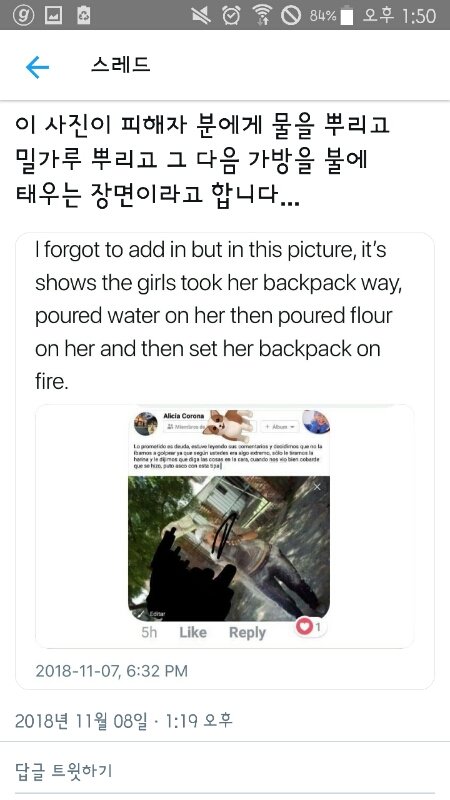 와 같은 대화를 나누고, 실제로 그 방탄 팬에게 밀가루를 쏟아붓고 물을 쏟아붓는 행위를 한뒤 인증샷까지 찍어서 올렸어. 그리고 방탄 팬의 가방을 훔쳐가서 불에 태웠고. 그리고 피해자인 학생이 직접적으로