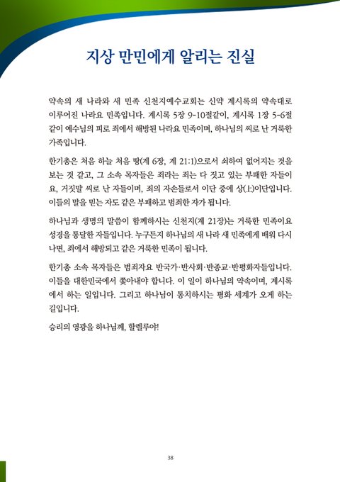 국민 여러분! 하나님이 약속하시고 창조하신 새 하늘 새 땅, 새 나라 새 민족인 신천지예수교회에 와서 하나님의 씨로 거듭나고, 추수되어, 인 맞아서 하나님의 나라 12지파에 속하기를 힘써야 합니다. 신천지에 가는 길을 막는 것은 범죄임을 알아야 합니다. “회개하라! 천국이 가까이 왔다.”는 말씀을 믿읍시다.