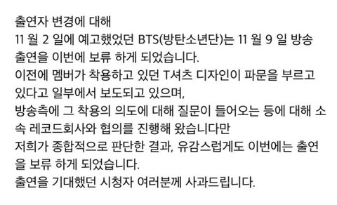 안간거 잘한일임 질문나왔을때 딱히 특별한 의도 없이 의미 모르고 입었다 이러면 한국에서 매장하려고 할거고 의도 있이 입었다 이러면 일본에서 난리날거고 차라리 안나가는게 나음 최근에 저 티셔츠 뜬금 소환해서 모든 커뮤 동시에 올려서 이슈만들고 기사 쏟아지고 뉴스까지 뜨게 만든 상황부터 이런일이 벌어질줄 예상했었다 누가 범인 일지는 모르지만 악의적 의도 였던건 확실히 알겠어 이 일로 또 이슈되고 방탄 일본에서 앞으로 더 곤란할거야