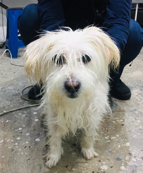 흰색인데 중간에 누르스름한 부분이 있구요. 털의 숱이 좀 적은게 피부병이 있는 듯 합니다. 꼬리는 단미가 안되었습니다. 미용은 한지 좀 되보이나 저는 단모종만 길러봐서 이 상태가 디자인 컷이? 들어간 건지도 잘 모르겠습니다.