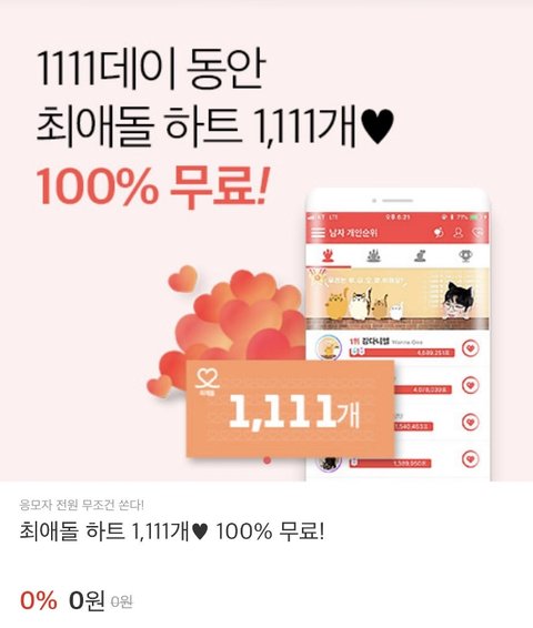 위/메/프에서 ㅊㅇㄷ 검색해서 응모하면 응모자 전원 ㅊㅇㄷ하트 1111개 준데 아이디있는 녤부리들 받으면 좋을거같오 ㅇㅅㅇ