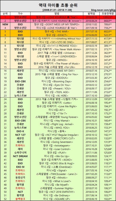 엑소 결국 방탄 초동 근처도 못가고 끝남
