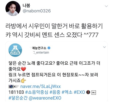 홈마 뺨치는 예쁜 사진도 올려주고 시우민 인라영상 멘트까지! 예능연구소 센스 이응지읒!!!