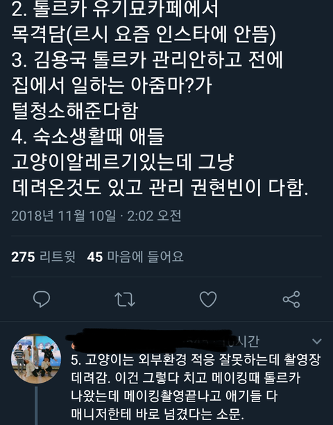 근데 김용국은 추석 연휴에 친구^^랑 경기도에 놀러갔었고 9월 8일 팬싸에서 고양이랑 어떻게 자냐니까 르시는 구석에 르시 없는데 왜 있는척했냐