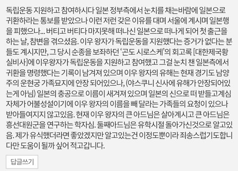 +++)계속 추가해서 미안한데 이건 꼭 알아야할거같아서. 이우왕자가 일본 신사에 계시대. 우리나라가 아무리 빼달라고 해도 일본을 위해 싸운 용사라며 안빼준대.. 지금까지도 일본을 위해 싸우신분이라며 자신의 나라를 뺏긴곳에서 추모받고 있다는게 말이 돼?