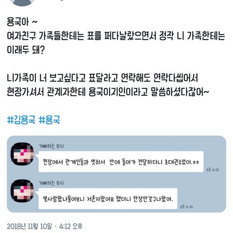 일단 걸그룹 소나무 김나현이랑 연애중임. 근데 이 이건 일단 그냥 넘어가고 ㅋㅋ (jbj활동하는동안 팬기만오지게한것) → 김용국이 키우는 르시라는고양이가있음 (회사에선 김용국로고가 고양이고 평소에 집사라는 타이틀로 엄청 밀고나감) 근데 그 르시가 유기견카페에 올라와있음ㅋㅋ고양이가 가출or 버린것 (jbj 시절에도 다른멤버랑 매니저가 관리했음) →근데 그와중에 갑자기 팬이 김용국 비공계인별계정을 누가 찾아냄 그 계정에는 { 팬들 조공하는 옾챗 몰래관음하고 jbj연장싫다고하고 전여친과 럽스타가 있음
