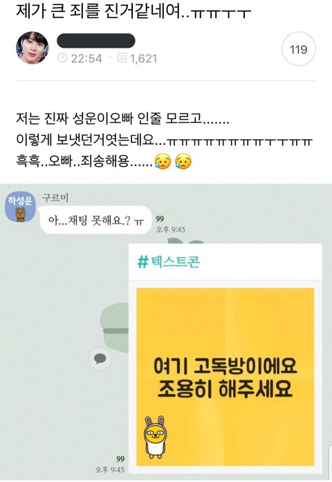 아까 고독한방에 하성운 들어와서 채팅했는데