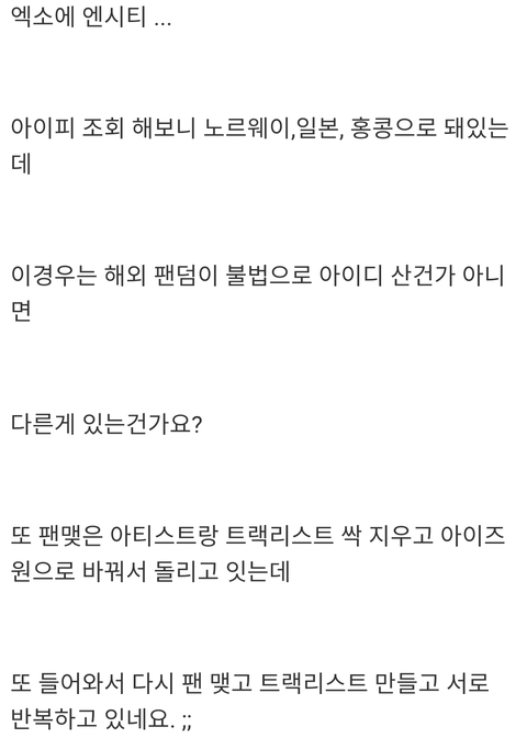본문에 저 팬분이 자기가 이전 트랙 리스트 다 지웠다는 내용 있는데 멜론은 자기 스밍 리스트는 못 지운다고 댓에 누가 말해줌