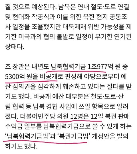그리고 “비공개 예산 대부분은 철도, 도로, 산림 협력 등 남북 경협 사업에 쓰닐 항목으로 알려졌다”