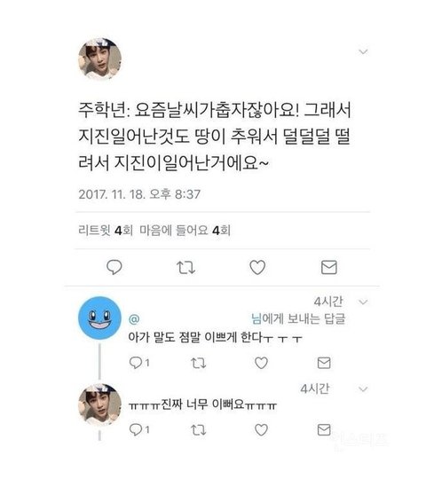 ㅅ;발 귀척도 적당히해야지 뭔 땅이 추워서 지진이 일어낰 ㅋㅋㅋㅋㅋㅋ빡대갈인가