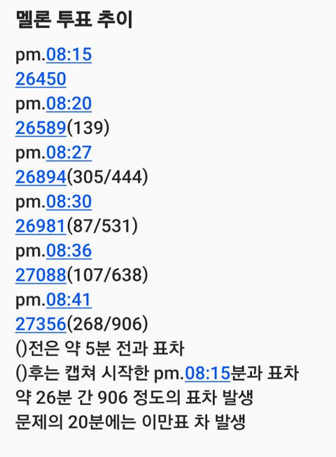 짹년들 추이 이상하다고 해서 걍 5분 간격으로 캡해서 추이 계산 했거든 26분 동안 900표 정도가 벌어졌는데 아까 총공 같은 것도 없이 팔천표를 뒤집고 이만표를 벌릴 수 있는거야? 나 진심 이 추이의 가능성을 묻는거임