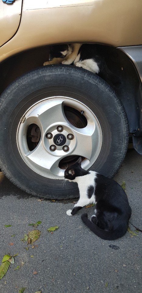 다른차에 피해가지 않게끔, 본인들의 차를 길냥이들 집앞에 대놓으셨습니다.