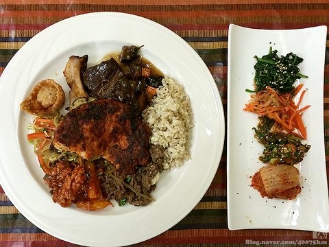 비빔밥 재료가 사이드로 나오고, 돼지 갈비, 소불고기, 오징어 무침, 잡채에 심지어는 떡볶이와 빈대떡, 오이소박이까지 등장합니다.