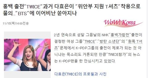 일본 우익들이 방탄 씹을 명분 없어지니 트와이스 쪽으로 넘어왔구만. 근데 제왑피는 애들한테 또 직접사과하라고 시키는거 아니야? 방탄이 사과했네 어쩌네 씹는인간들은 빅히트가 가수한테 떠넘기지않고 소속사 차원에서 잘 마무리 한거 알아야함. 소속사는 소속사고 지금도 아미들이 방탄 누명벗긴다고 해시달고 일본의 만행 퍼트리고 있으니 일본우익들도 트와이스 일 더 크게 부각시키진 못할거야. 계속 이러면 원스도 참전해서 세계에 일본의 치졸함을 알려야지.