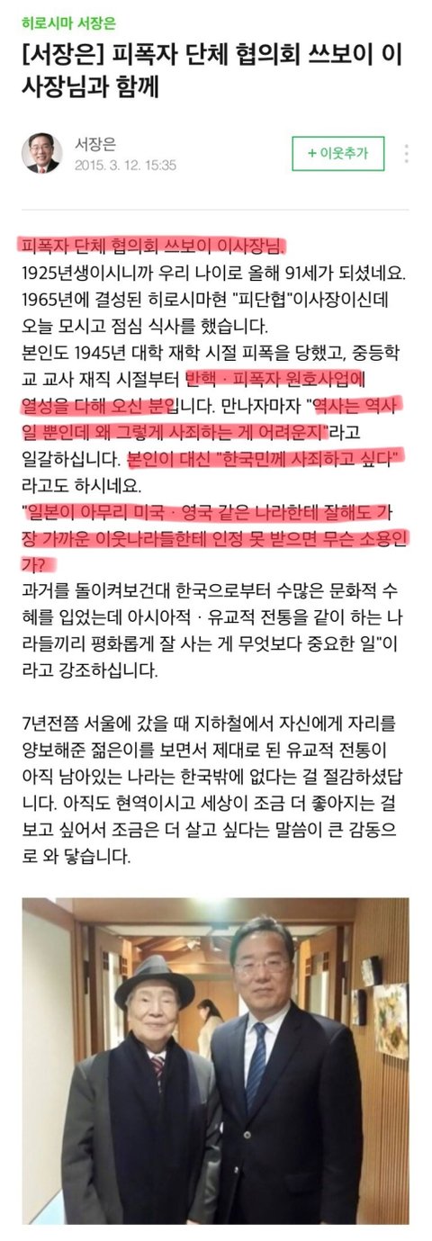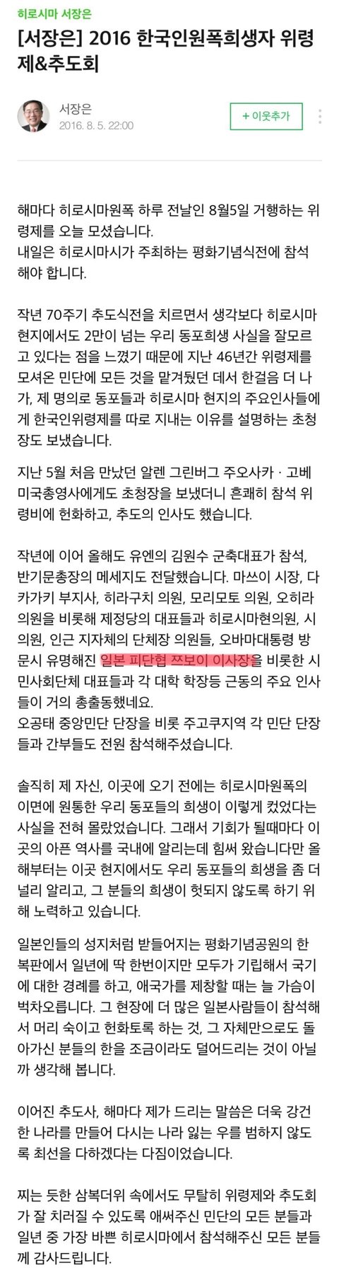 그리고 위에 언급했던 한국인 원폭희생자 위령제에 참석했던 피단협 쓰보이 이사장은 과거에 본인이 대신 ‘한국민께 사죄하고 싶다’고 말한 적이 있음