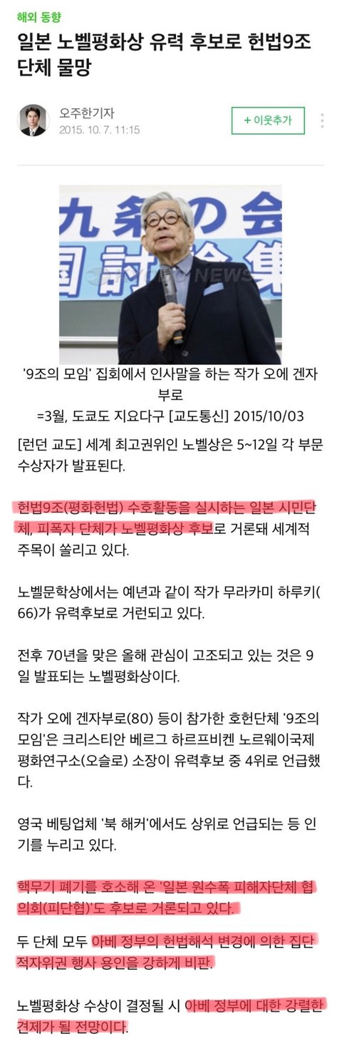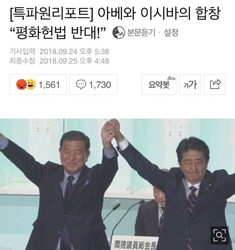 뉴스 자주 보는 애들은 알겠지만 아베 총리는 과거사에 대한 진정한 반성없이 자위대 전력을 계속해서 확충해가고 있고 평화헌법 건들면서 2020년까지 개헌을 통해 자위대의 합헌화를 추진하고 있음