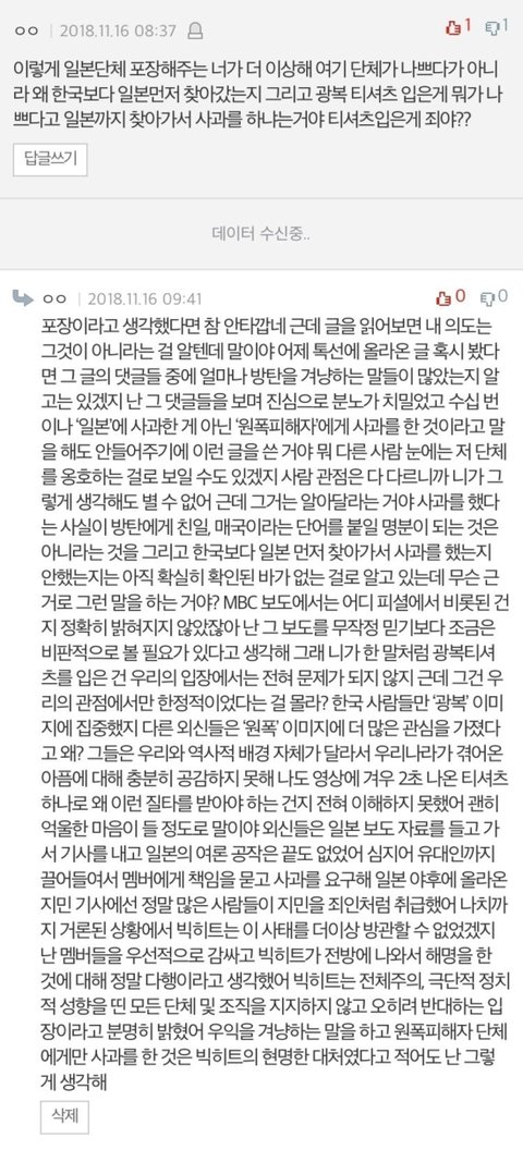 이번 입장문에 나온 사과때문에 소속사는 물론이고 방탄소년단에 대하여 ‘친일’, ‘매국’ 등의 아주 불명예스러운 단어가 붙고 있는데 문맹이 아니라면 이 글 똑바로 읽고 다시는 이런 워딩 언급하는 일이 없었으면 함