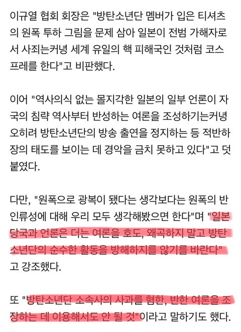 내가 이 글을 쓴 이유는 빅히트는 그럴 의도는 없었으나 ‘원폭 이미지가 있는 의상’의 착용으로 혹시나 상처받은 원폭 피해자가 있다면 그 분들께 사과를 드리는 것이지 ‘일본’이라는 국가를 상대로, ‘일본 정부’에 대하여 사과를 한 것이 절대로 아니라는 것을 명확히 하기 위함임