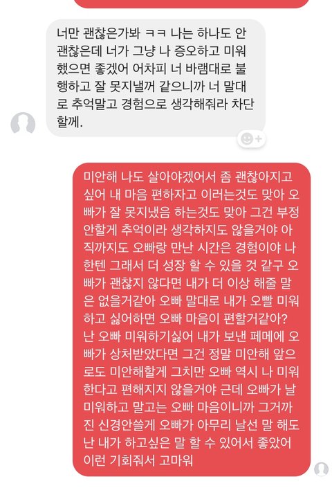 후회 안하고 앞으로도 안할거다, 넌 끝까지 예의없었다, 덕분에 좋은 사람 만날 수 있을 것 같다 등등의 말을 했네요.