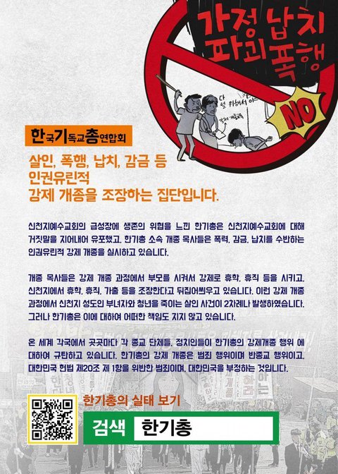 강제개종은 가족을 앞세워 납치, 감금, 폭행 등이 이뤄져 처벌이 제대로 되지 않는 등 ‘인권 사각지대’로 꼽힌다. 2018년 1월 9일 전남 화순의 한 펜션에서 구지인(27, 여)씨가 강제개종 과정에서 납치됐다 탈출하려다가 부모의 제압으로 질식사했다. 지난 2007년에도 개종을 거부하다 한 여성이 남편이 휘두른 둔기에 맞아 살해됐다. 이들 뒤에는 한국교회 목회자들이 있었다.