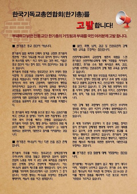 부패하고 낡은 전통 교단 한기총의 거짓됨과 부패를 국민 여러분께 고발합니다.