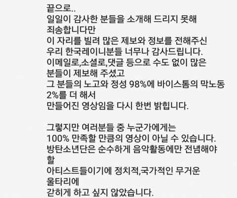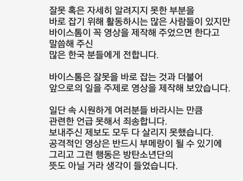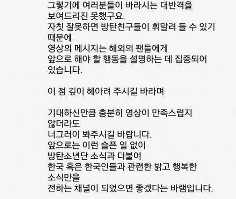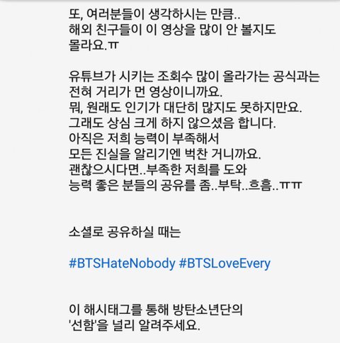 잠잠해지기를 바라는 것과 적극적으로 홍보해서 알려야 한다는 것 모두 탄이들을 소중하게 생각하는 같은 마음이라는 거 알아 방탄이어서 정말 행복하다