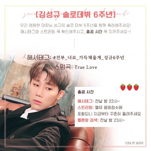 ♥김성규 솔로데뷔 6주년 이벤트♥ 오늘 밤 10시~ 해시태그 #전부_너로_가득채울게_성규6주년 밤 11시~ 스밍다운 곡 TrueLove 멜론창 검색도 함께하기