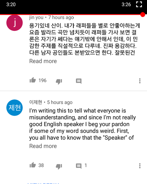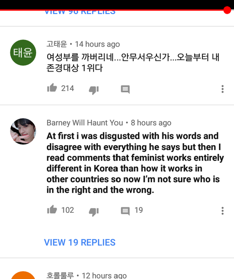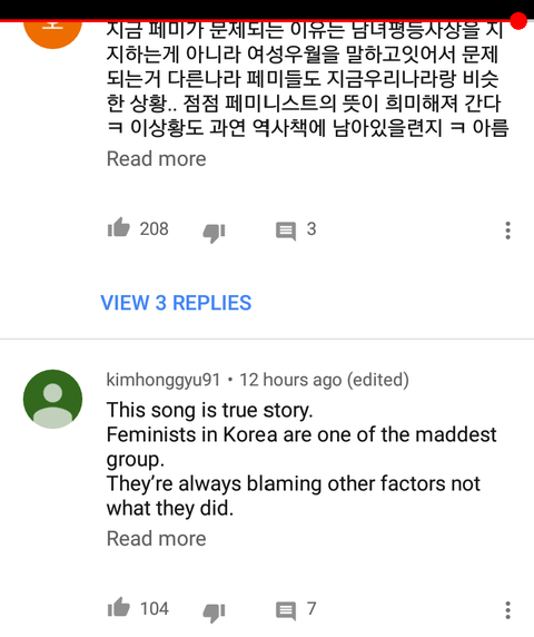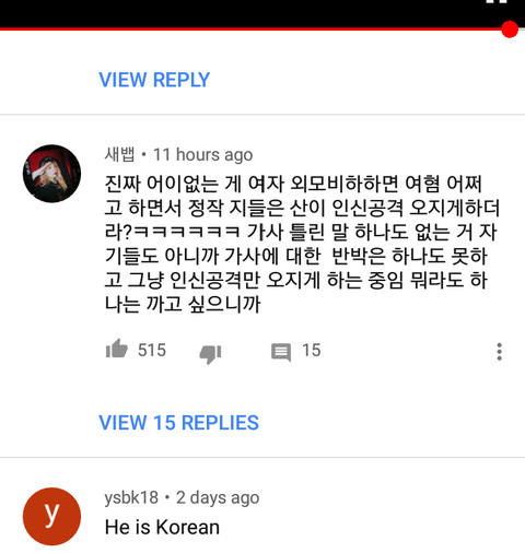 댓글상태왜이럼? 페미=여성우월주의라느니 인신공격한다느니 논점이되어야할 내용에서 벗어나서 산이 곡을 무비판적 찬양하는댓글이 훨씬많음. 해외애들 이거보고 "한국에선 페미=가장미친집단(maddest group)" ㅇㅈㄹ
