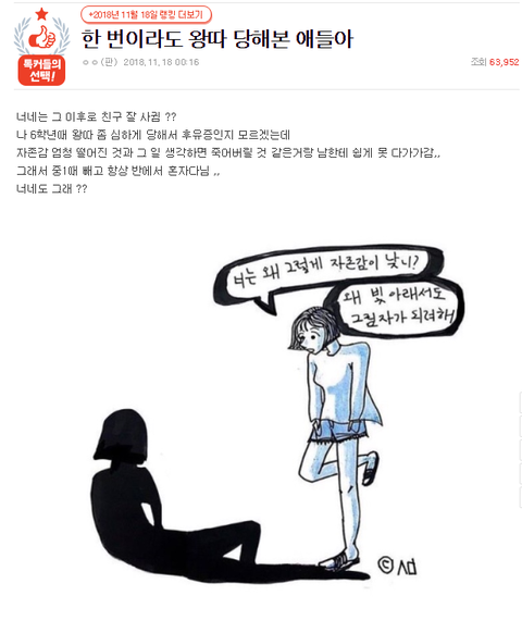 라고 말한 그 다음날 온갖 소문이 과장되어가면서 모두가 알게됬고왕따를 당함 온갖 폭행 성희롱 성추행 다당하면서 화장실가서 울면서 끅끅 참아내고 초5초반부터 그렇게 살았음 초6 끝물까지 그렇게 살았음