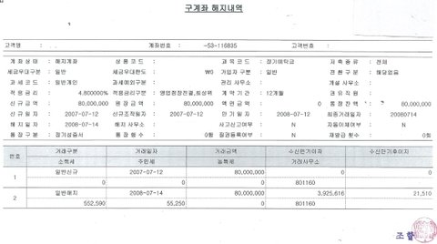 신규 일자가 2008년 7월 14일 8천만원만 입금내역이 조회가 되고, 나머지 금액 15,000,000 원/ 20,000,000원 / 30,000,000원 / 20,000,000원이 입금내역이 나오지 않는다는 것입니다.