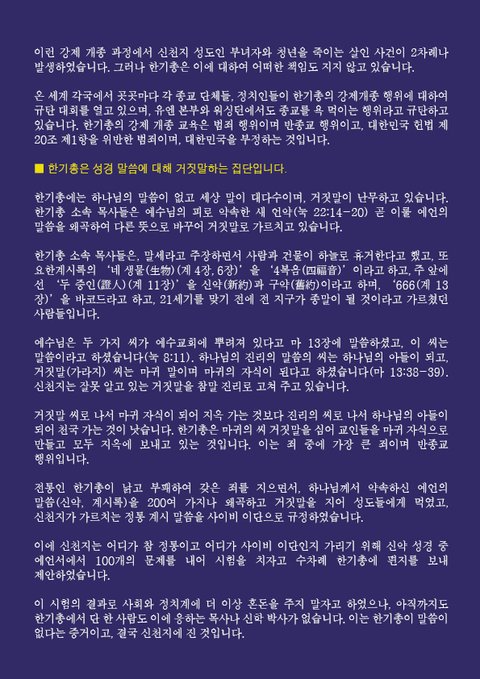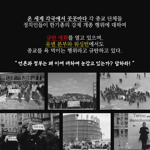 온 세계 각국에서 곳곳마다 각 종교 단체들, 정치인들이 한기총의 강제개종 행위에 대하여 규탄 대회를 열고 있으며, 유엔 본부와 워싱턴에서도 종교를 욕 먹이는 행위라고 규탄하고 있습니다. 한기총의 강제 개종 교육은 범죄 행위이며 반종교 행위이고, 대한민국 헌법 제20조 제1항을 위반한 범죄이며, 대한민국을 부정하는 것입니다.