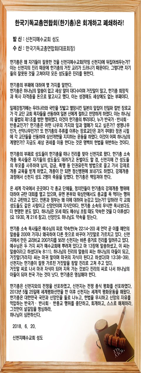 성경 말씀(히브리서 8장)처럼 낡고 부패하여 쇠하는 전통 한기총은 없어져 가는 존재입니다. 한기총은 신앙인들에게 더 이상 죄 짓지 말고, 더 늦기 전에 반국가·반사회·반종교 행위를 회개하고, 스스로 해체하고 성경 말씀 앞으로 나아와야 합니다. 그것만이 살길입니다.